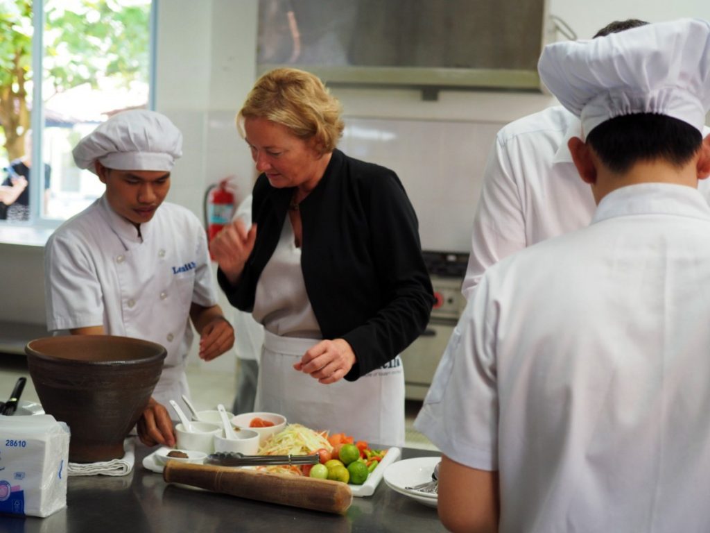 Lanith heißt die Ausbildungsstätte und hat Niederlassungen in der Hauptstadt Vientiane und in Luang Prabang, dessen Stadtkern das Siegel Unesco-Weltkulturerbe trägt. Die Besucher aus Luxemburg kommen in den Genuss der Kochkünste der Schüler – und Ministerin Paulette Lenert darf sich an der Zubereitung der laotischen Leibspeise Laap versuchen. Bis zum Jahr 2021 sollen 5.000 Schüler die Kurse besucht haben. Offiziellen Angaben zufolge finden 75 Prozent der Absolventen anschließend eine Anstellung.