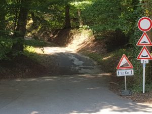 Unter dem „Quatre-Vents“ hindurch führt die Strecke nach Meispelt. Kaum jemand ist hier zur Mittagszeit unterwegs, schon gar keine Fahrradfahrer. Der nächsten Gruppe begegnen wir hinter Keispelt. Sie kommt uns schiebend zwischen Keispelt und dem „Direndall“ entgegen. „Passt op, do si Lächer an der Strooss“, ruft uns einer zu. Das hatten wir schon bemerkt, denn die Abfahrt im zweistelligen Prozentbereich ist höchstens für Mountainbikes geeignet, sicher aber nicht für Rennräder. Und in der Gegenrichtung ist sie ganz einfach zu steil; auf knapp einem Kilometer geht es rund 130 Höhenmeter hinauf. Und für uns im Schritttempo hinunter. Immerhin gibt es eine Warnung für diese Passage auf der Homepage des „Vëlosummer 2020“ (velosummer.lu). Trotzdem macht dieser Kilometer den ansonsten guten Eindruck der Route B komplett kaputt. Und er macht sie vor allem für Familienausflüge mit Kindern unmöglich.