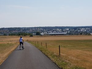 Los geht es aber wieder in Mamer, der Heimat des zweifachen Tour-Gewinners Nicolas Frantz. Entlang der Gleise führt die Route in Richtung Capellen. In der Mittagshitze ist das angenehm, denn der Radweg durchquert ein Waldstück. Vor Capellen ist es aber mit dem Schatten vorbei, auf den nächsten zehn Kilometern bis nach Keispelt sind Bäume rar. Trotzdem ist die Gegend um Kehlen abwechslungsreich. Die kurzen Passagen im Autoverkehr stören nicht wirklich, und auf den Feldwegen hat man mitunter spektakuläre Ausblicke. Über Nospelt geht es nach Kehlen und unmittelbar am Fußballstadion vorbei. Hier ist die Heimat der „Black Lions“, die seit einiger Zeit eine Fanfreundschaft zur Escher Jeunesse pflegen.