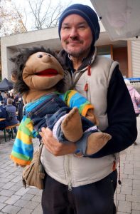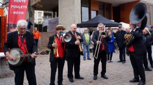 Auf der place de l’Etoile sind bereits alle Tische besetzt, eine Band unterhält mit Ragtime-Musik mit Megafon im Stile der vorletzten Jahrhundertwende. Wir treffen auf Heinz und Charly. Heinz kommt aus dem hessischen Hanau, lebt auf der Straße und unterhält für ein kleines Trinkgeld die Gäste mit seiner Bauchrednerpuppe Charly. „Ich habe hier gestern ein wenig beim Aufbau geholfen, durfte auf der Bühne übernachten und habe heute Morgen ein Gratis-Einlassbändchen bekommen“, lässt er uns wissen. „Ich find’s toll hier“, und schlürft genüsslich aus seinem Glas Federweißen.