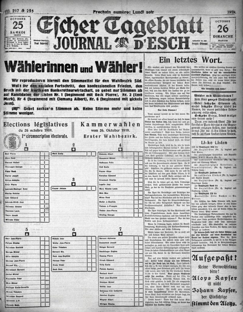 Septembre 1919, il y a très exactement 100 ans, le Grand-Duché est en effervescence et attend. Luxembourgeoises et Luxembourgeois s’apprêtent à faire un choix crucial, l’avenir du pays est en jeu. C’est la première fois à plus d’un titre: le mode de consultation par référendum, exercé par les hommes et les femmes de 21 ans et plus, décidant le 28 du mois du régime politique et de la future union économique avec la France ou la Belgique, et à la fin octobre, les premières législatives au suffrage universel.