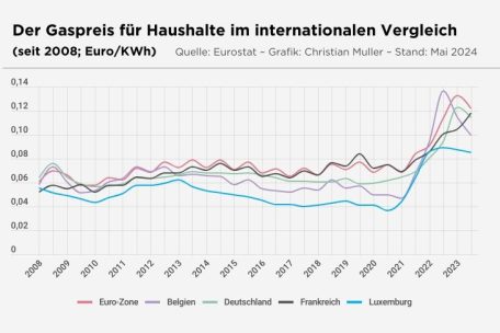 Im Gegensatz zum bisher relativ stabil gebliebenen Strompreis hat sich der Gaspreis in Luxemburg seit Ende 2020 somit verdoppelt. Ohne staatliche Stützungsmaßnahmen wäre der Anstieg noch höher ausgefallen. Wenn sie nun, wie geplant, Anfang 2025 auslaufen, rechnet Statec mit einem Preissprung von 17 Prozent.