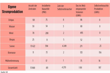 Erstmals wirklich zugelegt hat letztes Jahr auch Volumen und Anteil der selbst produzierten und verbrauchten Energie, die nicht in das Verteilungsnetz eingespeist wird. Die Zahl der Selbstverbraucher liegt mittlerweile bei 4.270 (Vorjahr: 1.257). Die sehr große Mehrheit von ihnen (4.249) setzt auf die Sonne. Zusammen haben sie 23 GWh produziert. Im Vorjahr waren es gerade mal 2 GWh.