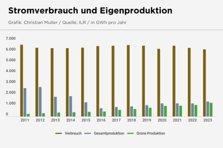 Besonders stark gewachsen ist letztes Jahr dabei die Stromerzeugung auf Basis erneuerbarer Energien (plus 18,9 Prozent). Dies sei vor allem auf den Anstieg der Windenergie (plus 59 Prozent) zurückzuführen, so das ILR. Noch mit dazu zählen Wasserkraft, Biogas, Fotovoltaik, Biomasse und Abfallverbrennung. Die Stromerzeugung auf Basis von Erdgas ist dabei weiter (minus 13 Prozent) zurückgegangen.