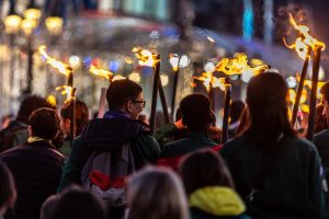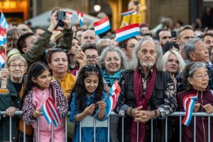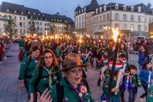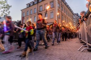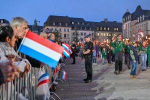 Fackelzug und Feuerwerk: Am Vorabend des Nationalfeiertags ist in Luxemburg-Stadt wieder eine große Party gestiegen. Die großherzogliche Familie schaute von der Tribüne auf dem Knuedler zu, wie die Militär-Musik und der Fackelzug vorbeizogen. Beim Umzug mit dabei: zahlreiche Vereine, Musik- und Folklore-Gruppen.