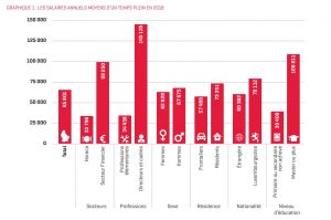 Zwei Faktoren relativieren diese Zahlen laut Statec: Einmal sei das Einkommen eng mit dem Bildungsniveau verknüpft und das unterscheide sich je nach Sektor sehr. Zum anderen gibt es einen relativ großen Unterschied zwischen Durchschnittslohn und Medianlohn. Letzterer liegt nämlich nur bei 49.548 Euro. Der Durchschnitt entspricht der Summe aller Löhne geteilt durch die Anzahl der Beschäftigten – der Median dem Lohnniveau, bei dem 50 Prozent der Beschäftigten einen höheren und 50 Prozent einen niedrigeren Lohn verdienen. Der Durchschnitt wird laut Statec also „hochgezogen“, wenn einige wenige Menschen extrem hohe Gehälter verdienen – während die Höhe des Medians von diesen Extremwerten nicht so stark beeinflusst wird.