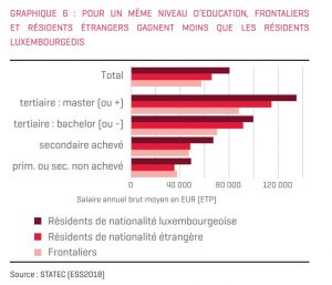 Einen Schnitt verzeichnet Statec aber: „Ein Ausländer verdient im Durchschnitt 82 Prozent des Gehalts eines Luxemburgers, ein Grenzgänger 72 Prozent.“ Die Durchschnittsgehälter der hierzulande ansässigen Personen liegen in allen Sektoren über denen der beiden anderen Gruppen. Das ist für die Statistiker auch nicht mit dem Gefüge von Branchen und Bildungsniveau zu erklären. „Ein Grenzgänger mit einem bestimmten Bildungsniveau verdient im Durchschnitt so viel wie ein Luxemburger auf dem darunter liegenden Niveau“, schreibt Statec. „Beim gleichem Bildungsniveau üben die Einwohner Luxemburgs einträglichere Berufe und Positionen aus.“