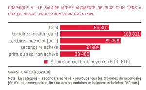 Statec führt diese Unterschiede vor allem auf das Bildungsniveau der Beschäftigten zurück. „Da die Zugehörigkeit zu einer Berufsgruppe in hohem Maße durch den Bildungsstand bestimmt wird, gibt es logischerweise auch signifikante Unterschiede in der Entlohnung.“ Der Durchschnittslohn eines Arbeitnehmers mit Sekundarschulabschluss liegt demnach um mehr als 30 Prozent höher als der eines Arbeitnehmers ohne. Mit einem Bachelor in der Tasche verdient man durchschnittlich sogar 50 Prozent mehr als nur mit dem Sekundarschulabschluss. Der Absolvent eines Masters wiederum erhält ein 30 Prozent höheres Gehalt als einer mit Bachelorabschluss. „Die Spanne zwischen dem niedrigsten und dem höchsten Bildungsniveau liegt beim Faktor 2,8“, schreibt Statec. In absoluten Zahlen ausgedrückt: Mit einem Masterabschluss verdient man durchschnittlich 108.811 Euro, mit einem Bachelor immer noch 81.446 Euro. Ganz ohne Sekundarschulabschluss sind es nur 39.400 Euro.