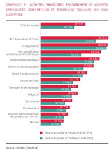 Aus der Statistik ist auch ersichtlich: Je nach Branche gibt es in Luxemburg große Lohnunterschiede. So liegen die Beschäftigten im Finanz- und Versicherungssektor mit einem Durchschnittsgehalt von 99.250 Euro an der Spitze. Es folgt die Bildung mit 98.835 Euro, wissenschaftliche und technische Aktivitäten mit 88.721 Euro und dann die öffentliche Verwaltung mit 86.582 Euro. Die niedrigsten Löhne werden im Handel, im Baugewerbe, bei Verwaltungs- und Hilfsdiensten sowie im Hotel- und Gaststättengewerbe gezahlt. „Im Finanzsektor ist der Durchschnittslohn dreimal so hoch wie im Hotel- und Gaststättengewerbe“, schreibt Statec. Im Horeca-Sektor ist der Durchschnittslohn sogar insgesamt nur halb so hoch wie der Landesschnitt.