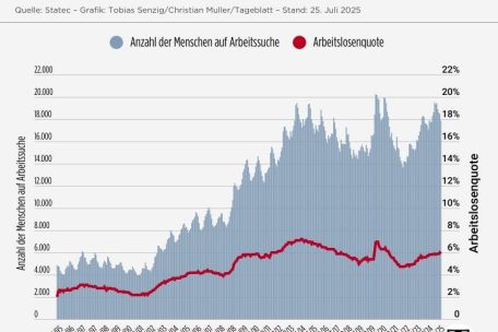 Die Schaffung neuer Arbeitsplätze hat sich zuletzt aber sehr deutlich verlangsamt. Seit Dezember 2024 ist es ein Plus von knapp 3.000 neuen Arbeitsplätzen. Ein deutlicher Rückgang verglichen mit den Vorjahren, als jeden Monat mehr als tausend neue Arbeitsplätze entstanden sind.