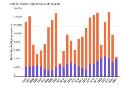 Bereits die Entwicklung im Jahr 2024 war nicht erfreulich. Wegen der schrumpfenden Zahl der Jobs im Bauwesen hat der Privatsektor in dem Jahr, netto, kaum neue Jobs geschaffen. Es war das schlechteste Jahr seit der Finanzkrise von vor 15 Jahren.