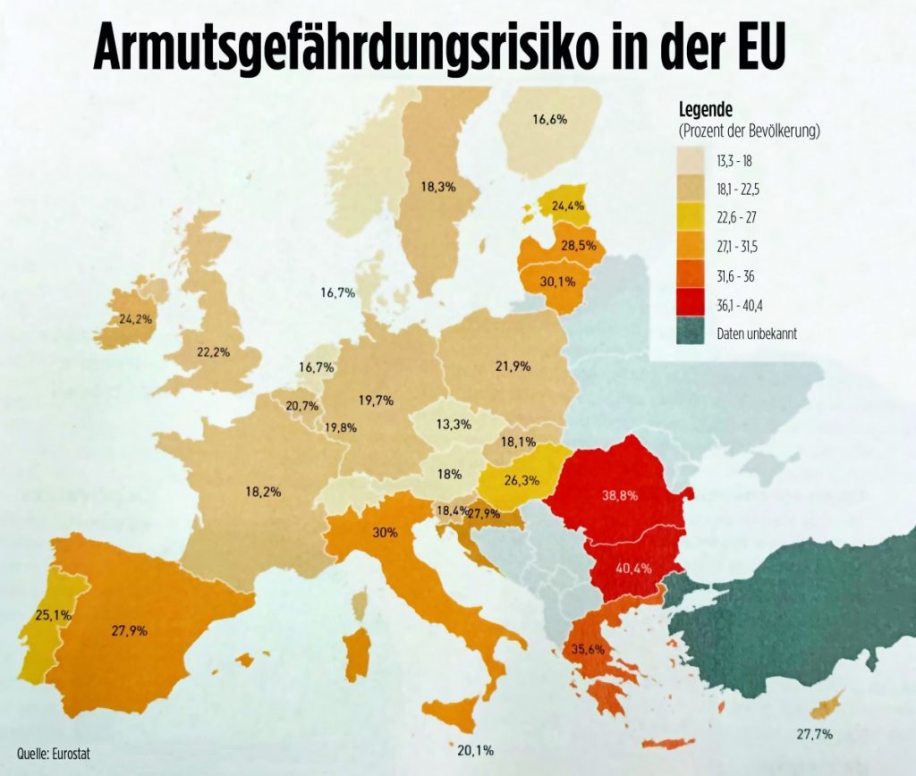 Und dies funktioniere in Luxemburg ganz ordentlich, finden Wagener und Thelen. Ohne Umverteilung würde das Armutsgefährdungsrisiko hierzulande bei 30 Prozent liegen, aktuell liegt es bei 18,7 Prozent. Das sei ganz passabel im EU- Vergleich (siehe Karte, Zahlen von 2016). Aber das könne man optimieren. Aktuell würde der Staat soziale Beihilfen oft gestreut an alle verteilen. Dabei gehe es darum, die sozialen Leistungen den Bürgern zukommen zu lassen, die wirklich bedürftig sind.