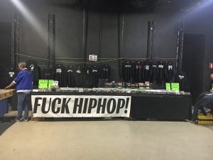 In einer lockeren Atmosphäre wurde an den Ständen über die Lieblingsmusik fachsimpelt und fleißig in den CD-Verkaufskästen gestöbert. Das gleiche Bild bot sich im zweiten Saal, nur dass dort auch an der Bar bei einem Getränk diskutiert wurde. An einem Stand wurde eine tiefe Abneigung gegen Hip-Hop kundgetan (siehe Foto). „Das ist keine Musik“, sagte Mike, ein Besucher. Er steht auf die luxemburgische Band Desdemonia.