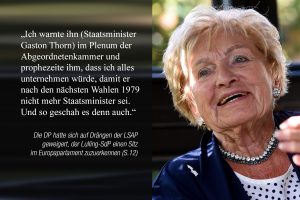 Doch damit redet sie ihre Rolle im damaligen politischen Leben klein. Denn ausgerechnet an ihrer Person soll die Fortführung der damaligen DP-LSAP-Koalition von 1974-1979 gescheitert sein. Tatsächlich hätte sie 1979 zusammen mit Henry Cravatte als zweiten Abgeordneten der 1972 gegründeten „Sozialdemokratischen Partei Luxemburgs“ (SdP) eine zweite Auflage von Blau-Rot ermöglichen können. Da die LSAP jedoch keine Lulling duldete, sollte sie mit einem Botschafterposten in Straßburg aus der Landespolitik verbannt werden. Was sie ablehnte.