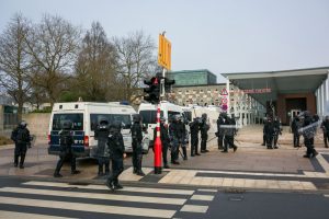 Die Stimmung im abgesperrten Bereich war entsprechend aufgeheizt. Demonstranten versuchten, die Absperrung der Polizisten zu überwinden. Dabei wurden Beteiligte zum Teil auch mit körperlichem Einsatz zurückgedrängt.