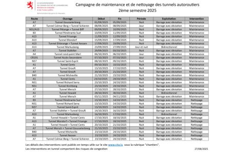 Es ist wieder so weit: Luxemburgs Autobahntunnel müssen gewartet und gereinigt werden. Am 1. September geht es mit dem Tunnel „Grousselerbierg“ los – und dann folgen nach und nach die anderen. Der letzte Termin ist für den 23. bis 24. Oktober eingeplant, schreibt die Straßenbauverwaltung in einer Mitteilung. Die Arbeiten werden überwiegend nachts erfolgen, um den Verkehr zu entlasten.