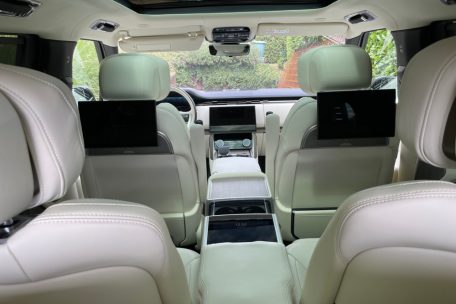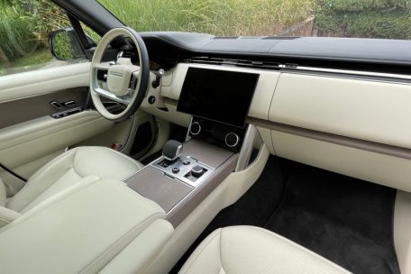 Glatt und abgerundet kommt der neue Range Rover daher. Ecken und Kanten weist er keine auf, die Türgriffe versinken in der Karosserie und die Mitfahrer in edlen Ledersitzen in einem noblen Interieur, das man am liebsten gar nicht mehr verlassen möchte. Unser „First Edition“ Range Rover V8 hatte zwei Sitze auf der Rückbank, getrennt durch eine elektrisch herausfahrende Mittellehne, mit Kommandotafel für Heizung, Klimaanlage, Lautstärke und Bedienung der Seitenrollos in den hinteren Fenstern sowie einem herausnehmbaren Tablett mit WiFi-Anschluss und jeweils einem Bildschirm an der Rückseite der vorderen Kopfstützen. Per Knopfdruck kann man das Fahrwerk zur Erleichterung des Einstiegs senken, bei schneller Fahrt senkt das aktive Fahrwerk die Karosserie automatisch ab.