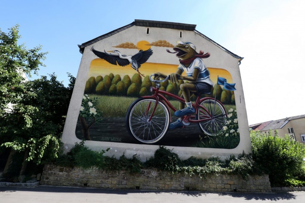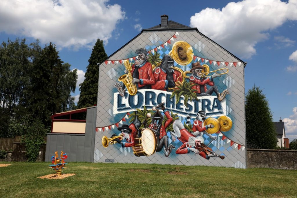 Diese intensive Auseinandersetzung lässt nun neben ländlichen Nutztieren und dem Wappen entstammenden Raben auch Elemente an den Wänden wiederkehren, welche die Einwohner mit dem Ort verbinden. Ein Mann, der Alain Welter bat, seiner Fassade neues Leben einzuhauchen, erzählte ihm zuvor, er sei dorthin gezogen, da er sich nach Ruhe sehnte, und gab dem Künstler dann freie Hand. Entstanden ist ein schlafender Mann in einer Hängematte mitten in einer natürlichen Wohlfühl-Oase. Auch das Tier-Orchester, das jetzt stets Einwohner wie Besucher des Dorfs am Ortseingang mit Pauken und Trompeten empfängt, passt zu jenen Menschen, die das Haus bewohnen. Als guter Nachbar weiß Alain Welter nämlich, dass unter diesem Dach besondere Affinitäten für Musik zusammenkommen, da mehr als nur ein Musiker dort zuhause ist. Dementsprechend passt also die Hülle auch zum Inhalt.