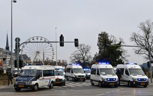 Samstag, 14.00 Uhr, Glacis: Die Teilnehmer der angemeldeten Demonstration „Polonaise Solidaire“ stimmen sich mit Musik und Ansagen über Lautsprecher ein und nehmen die nahegelegene Kreuzung in Beschlag. Als einige Autofahrer versuchen, sich durch die Gruppe von Demonstranten zu schlängeln, macht sich die Polizei daran, den Verkehr zu regeln.