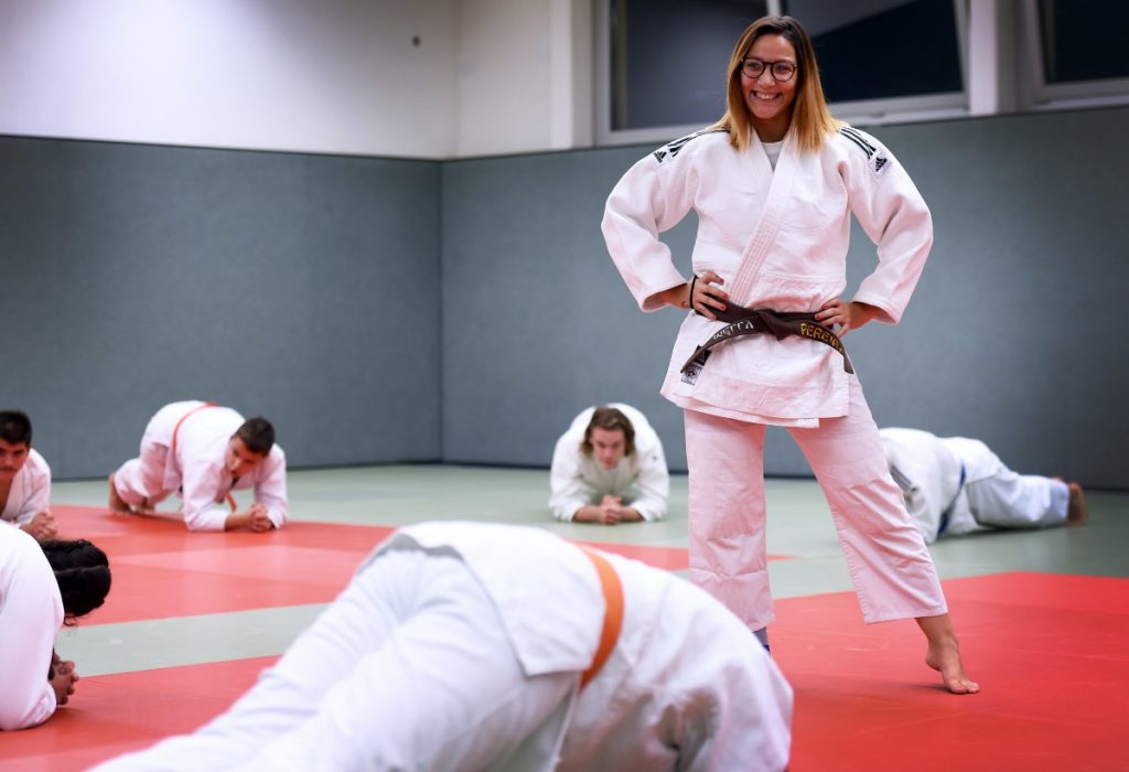 „Judo heißt Energie tanken und Aggressionen abbauen und“, ergänzt sie scherzhaft, „als Mädchen die Jungs flachlegen.“ Dabei, so unterstreicht sie, komme es nicht nur auf die eigene Kraft an: „Judo heißt konzentriert sein, sonst liegt man auf dem Rücken.“ Zwei- bis dreimal die Woche ist sie im Dojo, jeweils rund 90 Minuten. Zudem trainiert sie im Club die Fünf- bis 13-Jährigen. Sie trägt den braunen Gürtel. Nächste Stufe: schwarz. Sie geht es locker an: „Ich muss nicht bei Olympischen Spielen dabei sein!“ Judo ist aber nicht ihre einzige sportliche Betätigung. Als Frühaufsteherin ist sie bereits in den Morgenstunden beim Krafttraining in der nahen Sporthalle anzutreffen. Oder beim Joggen. Mal mit, mal ohne Hund.