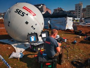 Denn unmittelbar nach dem Erdbeben hat sich Alain Lang am Dienstag letzter Woche auf den Weg in die Türkei gemacht – mit einem mobilen Satellitensystem im Gepäck. Vom Flughafen in Istanbul aus ging es mit einem weiteren Flieger in Richtung Hatay – im Süden der Türkei nahe an der Grenze zu Syrien gelegen. Der letzte Teil der Reise vom Flughafen bis nach Hatay führte über die kaputten Straßen einer Strecke, für deren Zurücklegen es normalerweise nur zwei Stunden braucht. „Das war aber sehr chaotisch und kompliziert, auch weil so viele Menschen und Hilfstransporte unterwegs waren. Wir haben dann insgesamt acht Stunden gebraucht“, erzählt Alain Lang während der Videokonferenz am Mittwochmorgen.