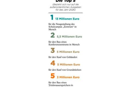 Der Schulbau im Zentrum der namensgebenden Ortschaft schlägt 2026 mit 13 Millionen Euro zu Buche – und ist bereits zu klein für die Schülerschaft der wachsenden Gemeinde. Um den Bau einer weiteren Schule wird man in den kommenden Jahren nicht herumkommen – ein entsprechendes Projekt soll auch demnächst vorgestellt werden. Konkreter wiederum wird es beim sehr teuren Sportcampus, den sich Mersch gönnen möchte.