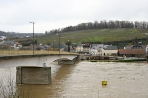 An der Mosel steigen die Wasserstände derzeit weiter an. In Remich wird die „Cote de vigilance orange“ von 620 Zentimetern am Pegel Stadtbredimus (Remich: 522 Zentimeter) am Freitagnachmittag überschritten. In der Nacht auf Samstag wird der Höchststand im Bereich 630 Zentimeter (Remich: 530 Zentimeter) erreicht. Zu einem deutlichen Absinken der Pegel kommt es nicht vor Samstagabend. Die „Cote de vigilance jaune“ von 530 Zentimetern am Pegel Stadtbredimus (Remich: 452 Zentimeter) wird voraussichtlich am Sonntag unterschritten.