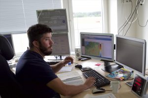 Im Dachgeschoss der Klimatologiezentrale werden alle Daten gesammelt. Auf den Computerbildschirmen flimmern Landkarten, Zahlen, Tabellen und Abkürzungen. Die Wetterexperten im Raum wissen aber genau, worum es geht. Das Prinzip, nach dem hier Wetter gemeldet wird, heißt Metar. Das ist ein kodierter Wetterbericht, der hauptsächlich von Piloten verwendet wird. „Es werden jeweils die Maximal- und Minimalwerte des Tages angezeigt – sowie Windextreme, Windrichtung und Windgeschwindigkeit“, sagt Zimmer. Zweimal pro Stunde werden die Werte an das Personal im Tower geschickt. Die Lotsen dort leiten die Daten dann direkt an die Piloten im Anflug weiter.