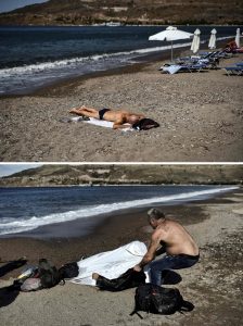 Auf beiden Bildern liegt ein Mann am Strand. Beide Bilder sind am selben Ort aufgenommen worden, auf der griechischen Insel Lesbos, am Strand des Städtchens Petra. Beide Männer liegen mit dem Gesicht im Sand. Aber der eine sonnt sich, der andere ist tot und wird von einem Einheimischen an Land gezogen.