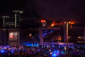 AFP-Reporter sahen am Freitagabend die Konzerthalle in Flammen stehen und riesige schwarze Rauchwolken in den Himmel aufsteigen. Rund 13.000 Quadratmeter des Gebäudes wurden von den Flammen erfasst, bevor der Brand unter Kontrolle gebracht werden konnte. Nachdem zunächst die Zahl von 60 Todesopfern genannt worden war, teilte das russische Ermittlungskomitee am Samstagvormittag mit, die Zahl der Toten habe sich auf mindestens 115 erhöht. Die Zahl der Verletzten war zu einem früheren Zeitpunkt mit etwa hundert angegeben worden. Die Bergungsarbeiten könnten noch Tag andauern, unter den Trümmern wurde weiter nach Opfern gesucht, wie der Gouverneur der Region Moskau, Andrej Worobjow, im Onlinedienst Telegram mitteilte.