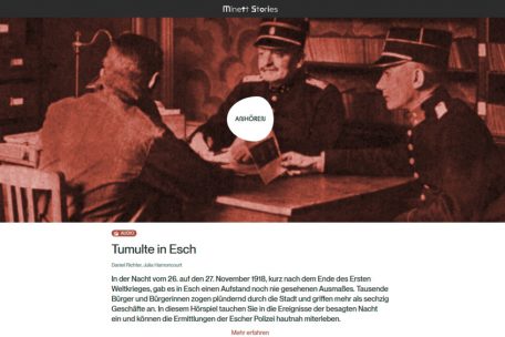 Das Kapitel „Tumulte in Esch“ lässt sich als Hörspiel erkunden. Recherchiert und konzipiert wurde es von Daniel Richter und Julia Harnoncourt, produziert vom Tonstudio Götze. Die Geschichte basiert auf einem Zufallsfund im Escher Stadtarchiv. Die dort erhaltene Korrespondenz zwischen Polizei und Stadtverwaltung gibt Einblick in ein verdrängtes Stück Stadtgeschichte: die Unruhen vom 26./27. November 1918, bei denen 5-6.000 Männer und Frauen über 60 Geschäfte und Privathäuser in Esch verwüstet und geplündert haben. Das 18-minütige Hörspiel schildert in verschiedenen Spielszenen die Entwicklung dieser Unruhen und die Beweisaufnahme durch die Stadtpolizei. Die fiktionalisierte Erzählung lässt die verschiedenen Perspektiven zu Wort kommen, wie sie sich in den Archivdokumenten wiederfinden lassen: die geschädigten Ladenbesitzer, die vermeintlichen Plünderer und die ermittelnden Beamten. Neben dem Hörspiel gibt es auch einen erläuternden Essay, der den zeitlichen Kontext wie auch die erhaltenen Quellen vorstellt und kritisch einordnet. So erfährt man, dass die Stadt ein besonderes Interesse daran hatte, die an den Unruhen beteiligten amerikanischen Soldaten hervorzuheben, da der Stadt ansonsten hohe Straf- und Entschädigungszahlungen drohten.