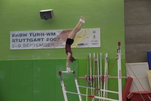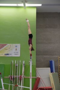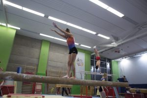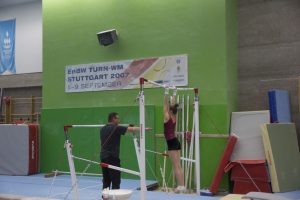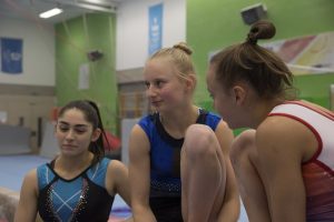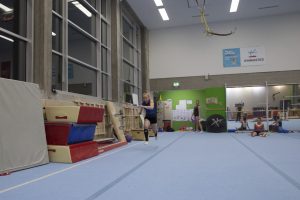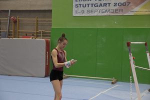 Während Céleste Mordenti ihre Choreografie am Boden noch einmal durchgeht, versuchen die beiden anderen Juniorinnen, Chiara Castellucci und Lola Schleich, Elemente am Stufenbarren und Sprung. Die Seniorinnen sind hingegen mit Kraftübungen beschäftigt, sowohl Aurélie Keller wie auch Maeva Baum plagten sich in den letzten Wochen mit Verletzungen herum – während der Einsatz von Keller noch fraglich ist, steht fest, dass Baum heute nicht an den Start gehen kann. Die Enttäuschung, den Wettbewerb ihres Heimatvereins zu verpassen, ist sichtlich groß. „Leider habe ich mir den Fuß gebrochen und deswegen auch die Qualifikationswettbewerbe für die EM verpasst, das ist schon sehr hart. Ich hoffe, dass ich im neuen Jahr nun wieder richtig angreifen kann.“