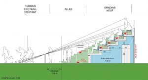Die neuen „Gradins“ werden ca. eineinhalb Meter vom Spielfeld nach hinten versetzt. Das ist dem Gesamtkonzept der Renovierung des Stadions geschuldet. Wenn die Haupttribüne aktuellen Sicherheitsnormen angepasst wird, dann muss mehr Platz für Fluchtwege nach vorne geschaffen werden und das Spielfeld etwas von der Tribüne weg verschoben werden. In einer ersten Phase werden die „Gradins“ also weiter entfernt vom Spielfeld sein. Fünf Reihen mit Klappsitzen sind vorgesehen. Im Vergleich zu heute und den sechs Sitzplatzreihen reduziert sich die Sitzplatzkapazität von aktuell 770 auf 700 Stühle. Das ist zwar nicht viel, trotzdem wird sich das Erscheinungsbild komplett verändern. Denn die „Gradins“ wurden als Stehtribüne konzipiert und haben insgesamt 18 Reihen. Nun werden es noch fünf sein, die Gesamthöhe bleibt allerdings mehr oder weniger unverändert, sodass die Sicht weiterhin gut sein dürfte und der Stadioncharakter erhalten bleibt. Unter den Rängen soll u.a. weiter die Berieselungsanlage untergebracht werden.