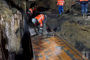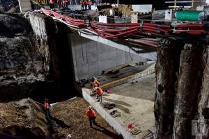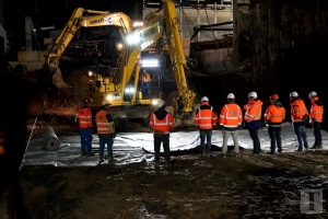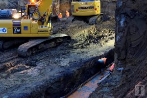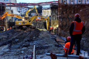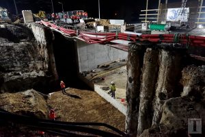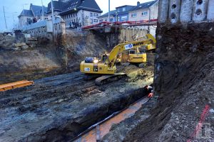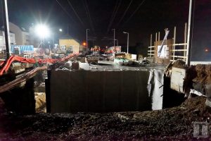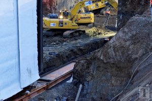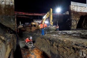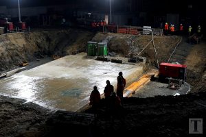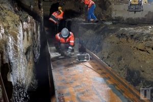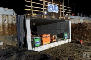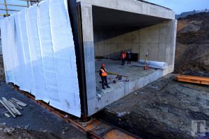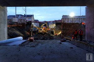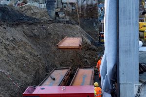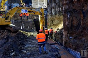 Parallel dazu wurde reichlich Erdmasse genau an der Stelle ausgebaggert, wo später die Unterführung hinkommen sollte. Aber: Der Schifflinger Boden wollte nicht mitspielen. Der Grund war aufgeweicht und der Untergrund deshalb nicht stabil und solide genug für den 1.400-Tonnen-Klotz. Das ergaben jedenfalls die Messungen der Mitarbeiter des „Bureau d’études Schroeder et Associés“. Deshalb breiteten die Arbeiter eine wasserdichte Plane aus. Darauf wurde dann eine spezielle, nicht-poröse Gesteinsmasse geschüttet.
