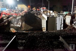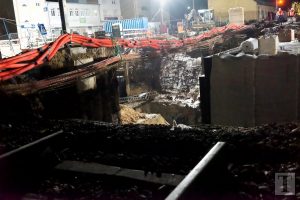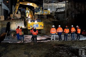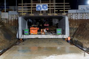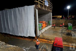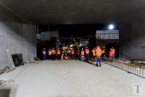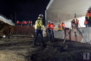 Am frühen Ostermontag war es so weit: Um Punkt 3.50 Uhr konnte die 1.400 Tonnen schwere Bahnunterführung mithilfe eines Hydrauliksystems unter die Bahnstrecke in Schifflingen geschoben werden. Das eigentlich für 23 Uhr geplante Manöver hatte sich als komplizierter als erwartet entpuppt: Hatten zunächst das Abtragen und der Abtransport der Boden- und Gesteinsmasse – etwa 5.000 Kubikmeter, was rund 350 Lkw-Ladungen entspricht – den Ablauf verzögert, bereitete dann das Verlegen der Gleitschienen Probleme. Der Untergrund, auf den die Schienen verlegt wurden, musste nämlich zusätzlich gefestigt werden.