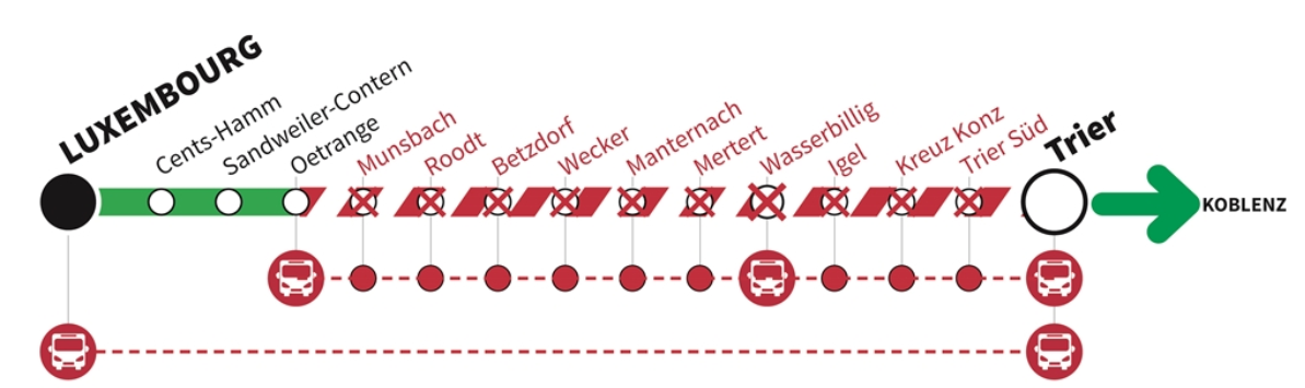 Die Ersatzbusse, die zu dieser Zeit eingesetzt werden, verkehren zwischen Oetringen und Trier mit Stopp an allen Haltestellen und Zwischenstationen. Weitere Busse fahren zwischen Luxemburg und Trier (mit Anschlüssen ab Trier). Die CFL teilt außerdem mit, dass aus Platzgründen die Mitnahme von Fahrrädern in den Ersatzbussen nur begrenzt möglich ist.