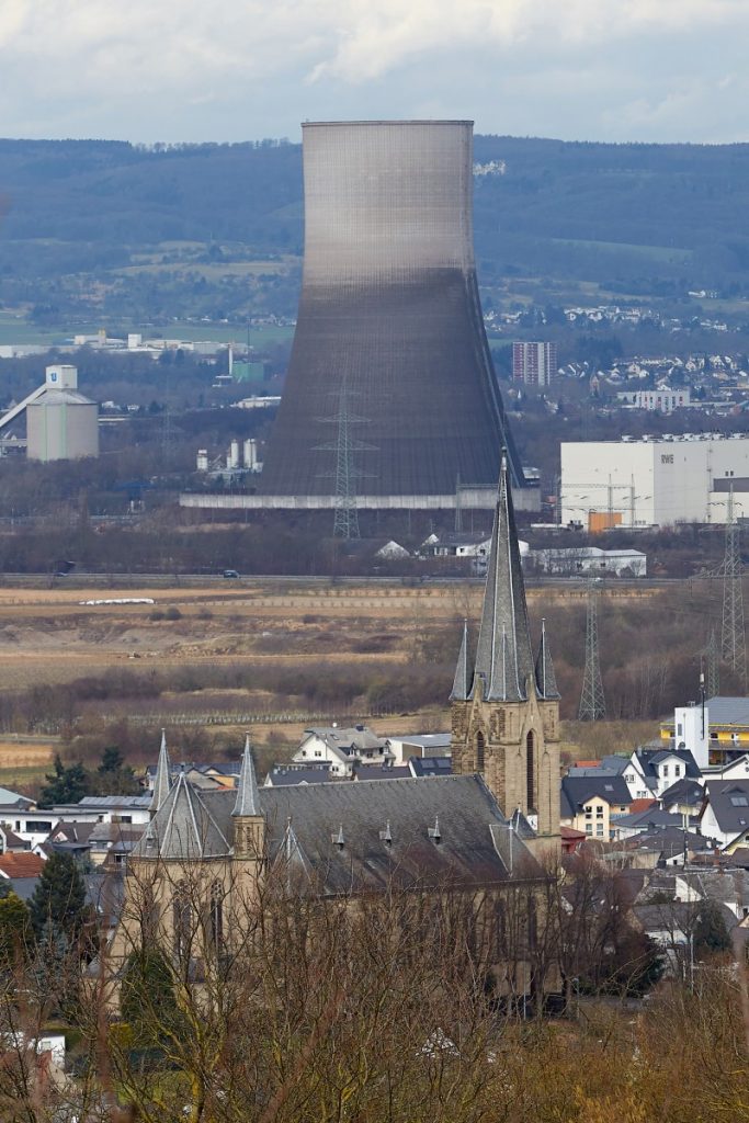 Eine Hebevorrichtung soll auf dem weithin sichtbaren Kühlturm (höher als der Kölner Dom) nahe Koblenz mit Seilwinden eine besondere Abrissmaschine nach oben hieven. Stück für Stück soll sie die Turmmauer von oben her spiralförmig abknabbern.