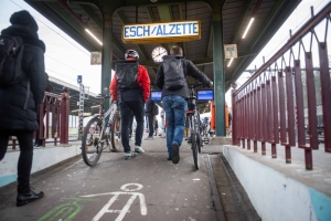 Es ist 8 Uhr am Escher Bahnhof. Gestresste Menschen eilen in Richtung Bahnsteig, jeder Atemzug bleibt kurz in der eisigen Luft hängen. Jo Klein von ProVelo schiebt sein Fahrrad die Rampe zum Steg hoch und erklärt, dass nicht alle Bahnhöfe gleich gut für Fahrradfahrer ausgestattet sind. „Bei verschiedenen Bahnhöfen gibt es neben der Treppe nur eine schmale Spur, in der man das Fahrrad hochschieben kann – das ist allerdings relativ unpraktisch, weil man dann ständig mit dem Lenker gegen das Geländer prallt“, sagt Klein.