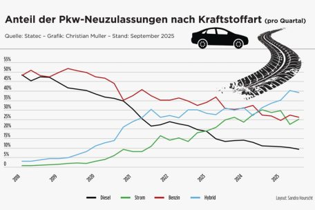 Rückläufig war dabei nicht nur die Zahl der neu zugelassenen Elektroautos, sondern auch ihr Anteil an den verkauften Fahrzeugen: Während dieser im dritten Quartal 2024 noch bei 30 Prozent lag, waren es in den letzten drei Monaten nur noch 25,3 Prozent. Zu den Monaten April bis Juni 2025 ist es aber bereits eine Verbesserung. Da war ihr Anteil auf 22,4 Prozent eingebrochen.
