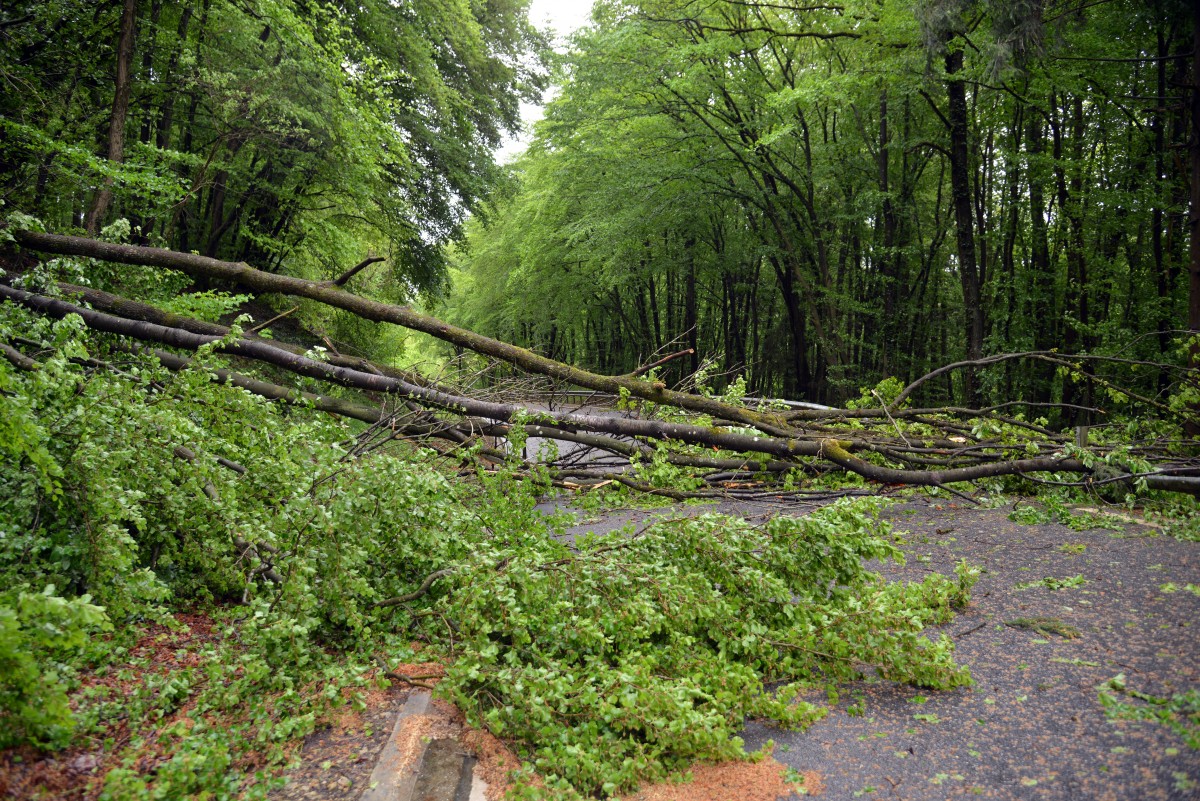 Seit dem späten Sonntagabend hatte es auch Feuerwehreinsätze in und nahe der Südeifel gegeben. Ein Polizeisprecher in Trier sagte, das Unwetter ziehe «einmal quer über die Eifel». Auf der Bundesstraße 418 seien bei Wintersdorf Bäume umgestürzt (Foto). Die Straße wurde gesperrt und sollte frühestens am Morgen wieder freigegeben werden. In Zemmer sei der Strom ausgefallen, weil ein Blitz in die Hochspannungsleitung eingeschlagen habe.