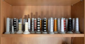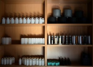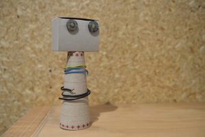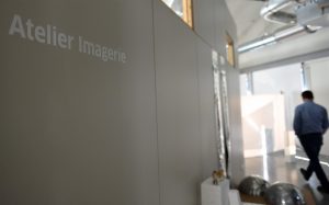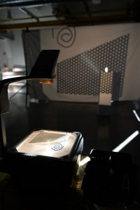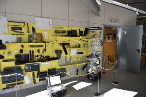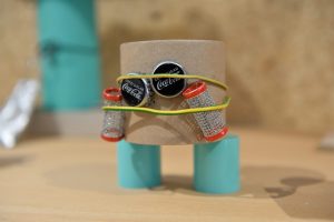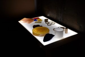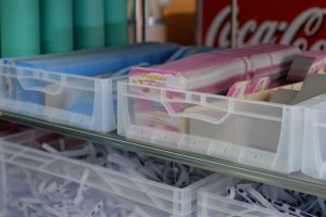 Hinter den Regalen liegt eine kleine Ausstellungsfläche. Hier zeigt Lynn Schammel, wie man die polierten Abfälle auf vielfältige Weise einsetzen oder mittels Lichtinstallationen in Szene setzen kann. Sie hat Design studiert und leitet den Materialbereich. Im „Labo“ bietet sie zusammen mit ihren Kollegen Workshops für Kinder an, bei denen sie zeigt, wie man zum Beispiel ganz ohne Kleber mit Abfallmaterialien basteln kann.