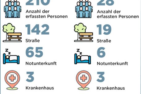 Ein Großteil würde die Wohnungslosigkeit gerne hinter sich lassen, nämlich 94 Prozent von 140 Personen, die diese Frage beantworteten. Mehr als 84 Prozent von 139 Befragten wenden sich an Fachkräfte aus dem sozialen Bereich, um eine Wohnung bzw. Arbeit zu finden, oder sich medizinisch versorgen zu lassen. Insgesamt 235 der erfassten Personen waren übrigens an dem Abend alleine unterwegs. Nur 52 hielten sich in Gruppen auf und 15 mit ihrer Lebenspartnerin oder ihrem Lebenspartner. Bei vier wurden keine Angaben gemacht.