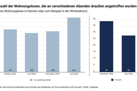Die Anzahl der Obdachlosen in den 24 Vierteln von Luxemburg-Stadt fällt damit leicht höher aus als noch bei vorangegangenen Ausgaben. Zum Vergleich: Im Dezember 2023 wurden 195 Betroffene in der Hauptstadt angetroffen, im Juni 2023 insgesamt 193. Im Oktober 2022 waren es bei der ersten Befragung 197. „In der Stadt Luxemburg ist (…) eine wahrnehmbare Evolution der Anzahl der erfassten Personen festzustellen“, heißt es in dem Bericht. Vor allem in den Vierteln Grund, Bahnhofsviertel und Bonneweg halten sich diesem zufolge inzwischen mehr Menschen ohne festen Wohnsitz auf.