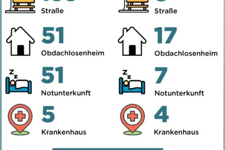 Die meisten Wohnungslose hielten sich am Zählabend in der Hauptstadt auf: insgesamt 242. Angesichts der Ergebnisse der vergangenen vier Erhebungen spricht der Bericht von einer „konstanten Präsenz“ der Betroffenen. Alleine auf der Straße, in Notunterkünften und im Krankenhaus wurden im vergangenen Dezember 191 Menschen gezählt – trotz geöffneter Winteraktion. Zum Vergleich: Im Juni 2024 wurden an diesen Orten (ohne die neue Kategorie „Obdachlosenheim“) in den 24 Stadtvierteln 210 Betroffene gezählt, im Dezember 2023 insgesamt 195, im Juni 2023 insgesamt 193 und im Oktober 2022 waren es 197. Für den Höchstwert im vergangenen Sommer gibt es laut dem Bericht bislang keine eindeutige Erklärung.