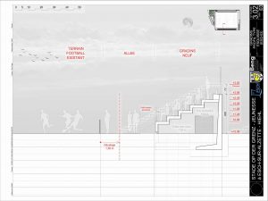 „’D’Grenz’ soll bleiben, wie sie war, nur moderner und sicherer werden“, sagt Stadtingenieur Lucien Malano, selbst eingefleischter Jeunesse-Anhänger und ehemaliges Vorstandsmitglied des Vereins. Momentan fassen die „Gradins“ offiziell 770 Menschen. So viele Sitzschalen wurden 2004 an den früheren Stehrängen angebracht. Nach dem Neubau werden es 700 Sitzplätze sein. Sie werden sich auf nur noch fünf Rängen verteilen. D.h. auch, dass die Höhe der Gegentribüne von jetzt rund 3,60 m auf 2,90 m reduziert wird. Gleich bleibt, dass es keine Überdachung gibt. „Wir wollen den Charakter der ‚Gradins’ beibehalten“, sagt dazu Lucien Malano. Seit vielen Jahren bröckelt die aktuelle Struktur vor sich hin und ist mehr oder minder baufällig.