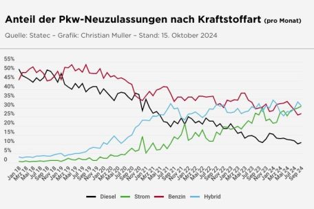 Auf die letzten neun Monate berechnet bleibt der Benziner weiter an der Spitze. Ihr Anteil an den Neuzulassungen bleibt in den ersten neun Monaten 2024, mit 30,4 Prozent, am bedeutendsten. Jedoch ist auch ihr Anteil weiter rückläufig. Im Gesamtjahr 2021 hatte er noch bei 38 Prozent gelegen, Mitte 2020 noch bei über 45 Prozent der Neuzulassungen.