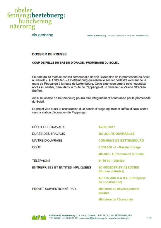 Pressemitteilung der Gemeinde Bettemburg von 2017 zum Bau des neuen Rückhaltebeckens (hier als PDF).