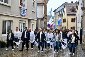 Viele in weiße Hemden und dunkle Hosen bekleidete Menschen jeden Alters hatten sich bereits in den frühen Morgenstunden rund um die verschiedenen Kneipen versammelt. Nicht nur Anrainer und ehemalige Echternacher nehmen nach wie vor gerne an der Springprozession teil, sondern auch die Jugend – und das obwohl am Dienstag keine Ferien waren. „Die Grundschule in Echternach ist die einzige, die an diesem Tag schulfrei hatte“, erzählte Pit Lengler, Lehrer an der Echternacher Grundschule. „Von den rund 500 eingeschriebenen Schülern sind 320 zur Springprozession erschienen. Damit alles einwandfrei klappt, haben wir ein paar Mal im Schulhof geübt.“