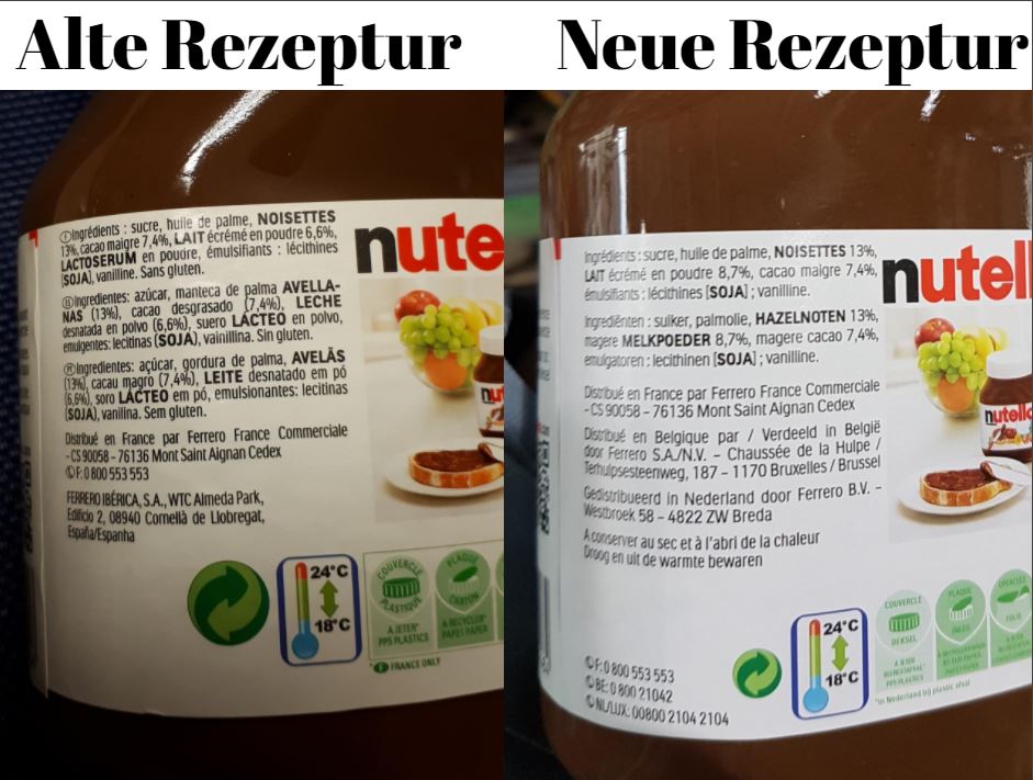 Dass sich die neue Rezeptur auch in Luxemburg eingeschlichen hat, gilt als ziemlich sicher. Auf den luxemburgischen Nutella-Gläsern wird ebenfalls 8,7 Prozent Milchpulver angegeben. Wie lang genau diese neue Rezeptur schon verkauft wird, ist nicht nachprüfbar. Tageblatt.lu-Leser Lars E. hat uns allerdings ein Foto eines schon älteren, im Colruyt gekauften Nutella-Glases zugesandt. Im Vergleich mit dem neuen Glas (Aufnahme von heute) sieht man deutlich die veränderte Zusammensetzung: