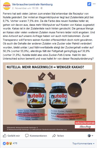 Statt wie bisher 7,5 Prozent Magermilchpulver enthält die Haselnusscreme nun davon 8,7 Prozent. Die Verbraucherzentrale geht davon aus, dass diese Vergrößerung des Milchanteils auf Kosten des Kakaos erfolgt ist. Den Kakaogehalt müsse man nämlich nicht angeben.